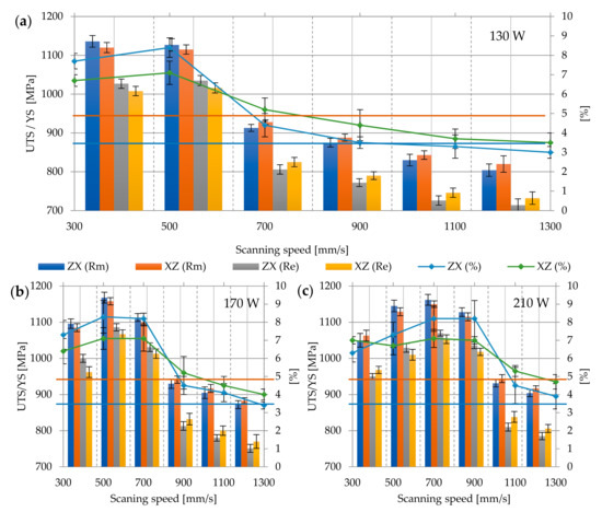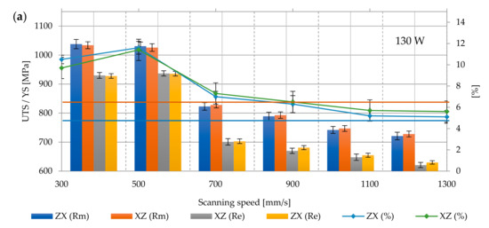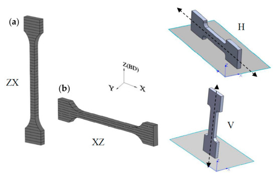 The layered structure obtained in DMLS technology makes the samples characterized by anisotropic mechanical properties. For this purpose, two types of samples were printed—vertically oriented samples (V, ZX) and horizontally orientated samples (H, XZ; Figure 5). The layering in both samples was perpendicular to the building direction (Z), while the tensile forces acting on the samples were oriented perpendicular to the layers in the ZX samples and parallel to the layers in the XZ samples. The tensile strength results presented in Figure 6, Figure 7, Figure 8, Figure 9 and Figure 10 were calculated on the basis of five consecutive tests.