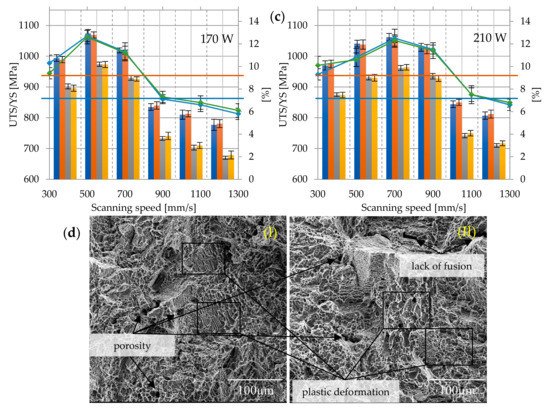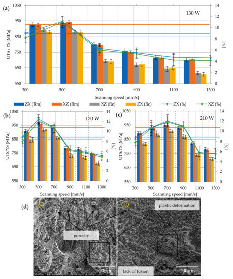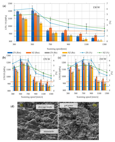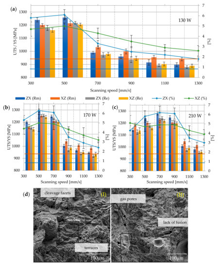 Strength parameters of as–built samples with different laser speeds and powers: (a) 130 W, (b) 170 W, (c) 210 W, and (d) fracture surface: (I) 130 W, 300 mm/s, ZX; (II) 130 W, 300 mm/s, XZ; 900×; Rm min
