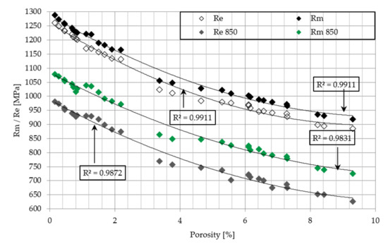 The obtained data is supplemented by the assessment of the influence of porosity on the strength and elongation of samples, the yield point and Young’s modulus (Figure 11 and Figure 12). With the increase of porosity, all these parameters revealed a downward trend, which clearly indicates that defects of the microstructure strongly affect the mechanical properties of the material.