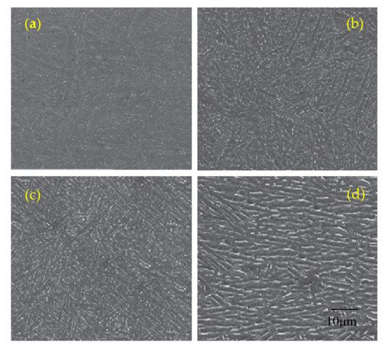 SEM images of microstructure of heat treated samples: (a) 650 °C, (b) 750 °C, (c) 850 °C, and (d) 950 °C.