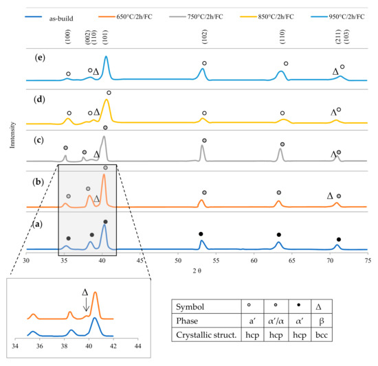 XRD spectrum of Ti6Al4V alloy DMLS: (a) as-build, (b) annealing at 650 °C, (c) annealed at 750 °C, (d) 850 °C, and (e) 950 °C for 2 h, cooled with a furnace.
