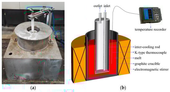 The experiments were carried out on self-made IC-AEMS equipment, and the experimental facilities and schematic illustration are shown in Figure 1. The equipment consisted of an electromagnetic stirrer, a graphite crucible, an internal cooling system, and a temperature-monitoring system. In the present experiments, the electromagnetic stirring frequency and current were imposed as 30 Hz and 60 A, respectively, and a K-type thermocouple was positioned at a distance of half the radius away from the wall to monitor the final temperature of the stirring. When the treatment temperature was adequate, the cooling rod was removed and the molten alloys were poured into a TP-1 mold (3.5 °C/s) [23]. In order to prevent a solid layer forming on the internal cooling rod, which hinders the cooling effectiveness, a boron nitride-coated cooling rod was preheated to 300 °C and was inserted into the melt immediately after the cooling air was introduced.