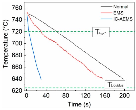 - The possible mechanisms for refinement above the liquidus temperature were explained as the stable chilling layer around the cooling rod providing undercooling for the precipitation of small Al3Zr nucleant particles, and the high cooling rate by applying IC-AEMS restraining the growth rate of these Al3Zr particles, which act as nucleation sites for α-Al when the melt cools below the liquidus temperature.
