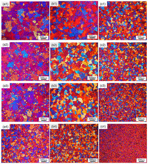Polarized light micrographs showing the microstructural characterization of Al-Zn-Mg-Cu-Zr alloy with different melt treatments: (a) without treatment, (b) with electromagnetic stirring (EMS), (c) with IC-AEMS, and pouring temperature: (1) 670 °C, (2) 660 °C, (3) 650 °C, (4) 640 °C.