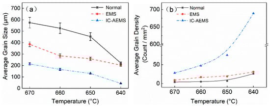 Figure 2 shows the cooling curves with three different treatments in liquid state, and the cooling rates were 0.55 (Normal), 0.68 (EMS), and 3.56 °C/s (IC-AEMS). Figure 3 presents the microstructural evolution in polarized light optical micrographs under varying pouring temperatures and different melt treatment applications. In this work, three different treatment conditions (i.e., (a) without treatment, (b) with EMS, (c) with IC-AEMS) and four different pouring temperatures (i.e., (1) 670 °C, (2) 660 °C, (3) 650 °C, (4) 640 °C) were investigated. The measured average grain sizes and the average number density are presented in Table 2 and Figure 4, respectively.