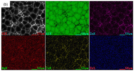 The EDS mapping results are illustrated in Figure 5. The chemical composition was relatively homogeneous within a single grain, but the eutectic phase composed of Zn, Mg, and Cu was mainly concentrated at grain boundaries. The solute elements’ distributions were non-uniform for the molten alloy without treatment in Figure 5a. Compared with coarse grains, fine equiaxed grains showed more grain boundaries in the same area; therefore, the solute concentrations in the boundaries were improved and the solute distributions were uniform relatively uniform after being treated by IC-AEMS (Figure 5b).