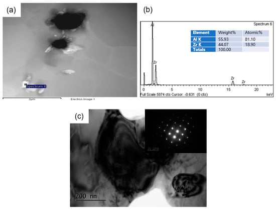 Al3Zr distribution in the Al-Zn-Mg-Cu-Zr alloy with IC-AEMS treatment: (a) TEM low magnification image; (b) EDS analysis corresponding to spectrum 6; (c) The bright-field TEM images and selected area electron diffraction (SAED) patterns taken from the particle Al3Zr and the adjacent aluminum matrix.