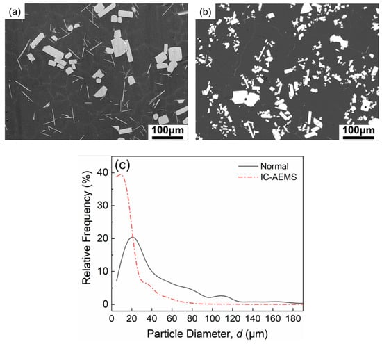 where ΔTg is the undercooling required, σ is the solid–liquid interfacial energy, ΔSV is the entropy of fusion per unit volume, and d is the size of the active nucleant particle. From the equation, it can be seen that the free growth undercooling is inversely related to particle size, that is, the smaller the nucleant particles, the higher the undercooling required to activate the grain initiation on the nucleant particles. Greer et al. [3] and StJohn et al. [22] also proposed that grain initiation was controlled by the linear dimension of the potent nucleant particle. In the case of IC-AEMS, the cooling rod provided an area of higher undercooling for nucleation. As shown in Figure 7, the size distribution of Al3Zr particles (0–200 μm) was much broader than that of the particles with IC-AEMS (0–100 μm). Additionally, more than 90% of the particles were concentrated in the range of 0–40 μm. The particle density was 3.4 × 103 /mm2 with IC-AEMS, while under normal conditions the density was only 1.2 × 103 /mm2.