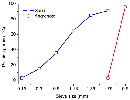 In tests, P·C 32.5R composite Portland cement produced by Ningbo Conch Cement Co. Ltd (Ningbo, China) was used. Its chemical composition was determined by an X-ray fluorescence spectrometer, as listed in Table 1. The mineral composition of cement was obtained by quantitative XRD, and the relevant results in Table 2 met requirements of the code “GB 12958-1999 Composite Portland Cement”. The fineness modulus of sand was 2.65, which was consistent with that of the code “GB/T 14684-2011 Construction Sand”. The aggregate was a continuous grade of gravel with the grain size between 5 and 10 mm. The particle size distributions of sand and aggregate used are shown in Figure 1. The local tap water in Ningbo was used for preparation of concrete specimens and soaking solution. Sulfate used in tests was the anhydrous sodium sulfate analytical reagent produced by Jiangsu Qiangsheng Functional Chemical Co. Ltd (Changshu, China), with a concentration of more than 99%.