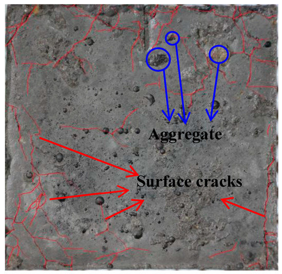 In this study, three mixture ratios were considered, corresponding to water-to-cement ratios of 0.45, 0.55 and 0.65. Here, it is worth noting that in practical engineering, concrete with w/c = 0.65 is rarely used. However, in order to clearly determine the influence of w/c on the crack evolution and its fractal dimension, such a water-to-cement ratio was chosen [40]. The weight ratio of cement, sand and gravel in concrete samples was 1:2:2. The sample size was 60 × 60 × 20 mm3. First, samples were molded and naturally cured for 24 h. Then, these samples were placed in a curing box with a temperature of 20 ± 2 °C and relative humidity of 95% for 28 days. Finally, the samples were placed in 8% sulfate etching solution for a dry-and-wet cycle in an indoor environment. The object studied in this paper is surface crack, and the surface of the sample is mainly cement paste, as shown in Figure 2. It should be pointed out that the aggregates would affect the nucleation and growth of corrosion cracks. However, from Figure 2 we can see that only a few aggregates appear, and most of the area of the surface is covered by cement paste. This implies that nucleation and propagation of corrosion cracks dominantly occur in the cement past. Therefore, the effect of aggregates on the evolution of corrosion cracks could be approximately neglected.