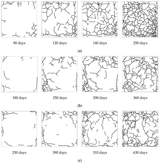 Concrete samples were first immersed in sodium sulfate solution of 8 wt.% for 1 day (as the wet state). Then the samples were taken out from sodium sulfate solution and dried naturally for 1 day. The total process was considered as a wetting–drying cycle. In order to keep the constant concentration of solution during soaking and prevent evaporation, the solution container was sealed with a plastic lid. Solution was periodically changed every month to ensure the solution composition. The corrosion tests were carried out indoors to keep a constant temperature and humidity. To avoid the effect of temperature on deterioration of concretes during drying, samples were naturally dried at room temperature. Taking their nucleation times and propagation rates of surface cracks into account, the evolution of surface cracks in samples with different water-to-cement ratios were assessed in various time intervals of corrosion, as shown in Figure 3.