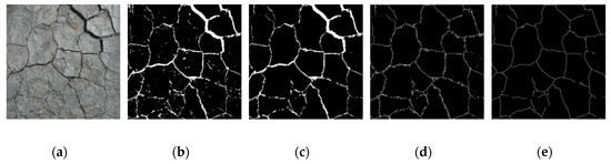 Based on Ren et al. [43] and an open image processing software (ImageJ ver. 1.8.0) (National Institutes of Health, Bethesda, MD, USA), digital image processing on surface cracking patterns of a concrete specimen under sulfate attack is illustrated in Figure 4. First, a polychromatic method was used to geometrically correct the color photo of surface cracks. After calibrating the image scale, image pixels were converted into actual length (in millimeters) and the image was cropped (Figure 4a). Next, color images of each sample were converted into grayscale ones and the latter were binarized using a grayscale threshold. The grayscale images were reversed (Figure 4b), and in this way, cracking areas of each sample were white regions on images. Then, in the case of a given threshold of crack length, a conventional opening operation was performed to reduce small white spots on aggregates, which were considered to be noise in binary images. If this was not effective, the remaining white spots (possibly represented aggregates) in the non-cracked area were removed by manual intervention (Figure 4c). Further, in the case of a given threshold of crack length, a crack fusion method was proposed to repair the crack. The binary image was expanded to eliminate a narrow space where the crack spacing was less than a threshold and the pixels were removed from the crack boundary. The skeletonization algorithm was then performed until a pixel wide crack skeleton was obtained (Figure 4d). Finally, a certain threshold was considered to tailor cracks with lengths less than the threshold (Figure 4e) as noise generated during skeletonization [26].
