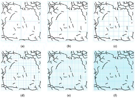 Methodology of calculating fractal dimension of surface cracks: (a) r = 1/2; (b) r = 1/4; (c) r = 1/8; (d) r = 1/16; (e) r = 1/32; and (f) r = 1/64.