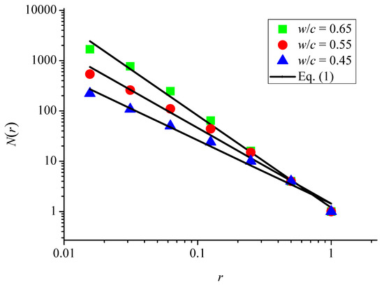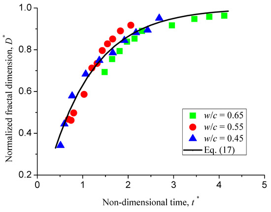 That is, the normalized fractal dimension monotonically increases with the non-dimensional time. The relationship between D* and t* is universal for all samples with different water-to-cement ratios. This can be further confirmed by Figure 14, where all the re-scaled experimental data are well collapsed on a single curve.