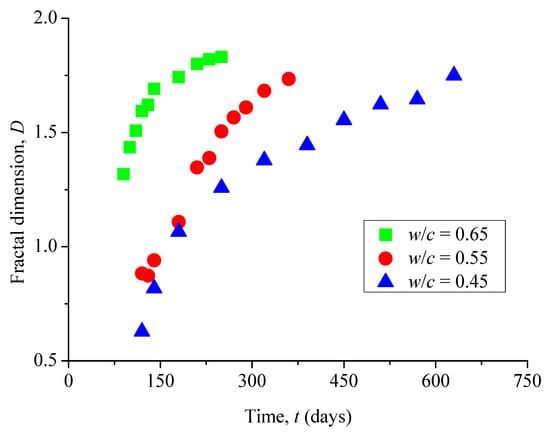 It is obvious to see in Figure 7 that the fractal dimensions of surface cracks in all these samples monotonically increase with increasing corrosion time. Among them, the reason why some fractal dimensions D are less than 1 (for example, w/c = 0.45, t = 120 days and 140 days) is that the surface crack of the sample has only just appeared, and the total length of the crack is very short. Compared with the surface size of the sample, it does not have the properties of lines, but only points or short lines.