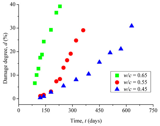 Let us consider the case as shown in Figure 5f, where the surface of a concrete sample was covered with a grid set of r = 1/64. The damage degree (%) caused by surface cracks can be defined as d = N/4096 × 100%, with N the total number of surface cracks passing through a small square box. It is seen in Figure 8 that the damage degree of surface cracks monotonically increases with the increase of corrosion time. Similarly, the damage degree increases by increasing the water-to-cement ratio. The results indicate that the water-to-cement ratio of concretes, as an important factor of corrosive solution, can considerably influence the damage degree.