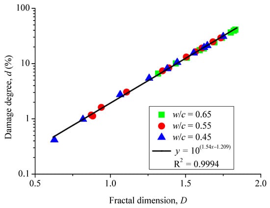 As shown in Figure 9, there is a power law relationship between the fractal dimension of surface cracks and its corresponding surface damage degree in a concrete specimen. However, the relationship seems independent of the water-to-cement ratio of concretes. That is, such a relationship can be considered to be universal.