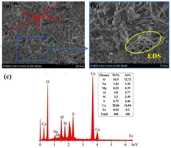 Photos of delayed ettringite formation (DEF) at a corrosion time of 600 days. (a) SEM image of DEF (2000× magnification), (b) SEM image of DEF (5000× magnification), and (c) energy spectrum analysis.