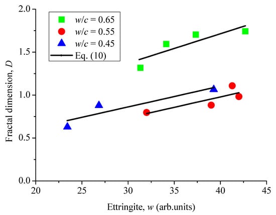The variation of fractal dimensions can mainly be attributed to production of DEF. The relationship between the fractal dimension and DEF production was obtained according to the previous studies of Chen et al. [48]. As seen in Figure 12, the increase of fractal dimensions is approximately proportional to ettringite. Therefore, it is concluded that the increased rate of fractal dimensions (dD/dt) is proportional to the change rate of DEF concentrations, which can be expressed as