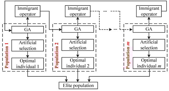 In [33], we investigated the application of the genetic algorithm (GA) in searching the optimal values of Kriging hyperparameter and demonstrated that GA has better advantages than gradient descent optimizer, owing to strong robustness and global searchability. In this paper, the multi-objective genetic algorithm (MOGA) is developed based on the MRSM thought, to find the optimal values of SVR hyperparameter θ. Comparing with GA, MOGA holds more flexible and adaptive design space exploration, and potentially avoid the influence of the plateau-like function profile [34]. Besides, MOGA breaks the limitation of a single population evolution of GA and uses multiple populations with different control parameters for optimization iterations [24,25]. Substantially, MOGA originates from GA and inherits natural selection and genetic characteristics, and the optimal solution of the objective function can be gained via successive iterations with selection, crossover, and mutation. The basic principle of the MOGA is summarized below. We first generate N initial populations (i.e., blade density, rotor speed, temperature, aerodynamic pressure, and gravity) with binary encoding, then the N new populations are obtained by the procedures of selection operator, crossover operator, and mutation. We further select the optimal individuals of each excellent population via the artificial selection operator, which are applied to the structure elite population to search for the optimal value of the objective function. Obviously, MOGA is essentially a combination of multiple GAs by a certain relationship. However, in MOGA, different control parameters (i.e., crossover probability pc,l and mutation probability pm,l) are used to complete the collaborative evaluation of multiple populations (l = 1, 2 …, N). Thus, the MOGA has both global and local search abilities by introducing immigrant operator to exchange messages among populations and avoid the destruction and loss of optimal individual information. In this process, the elite population does not participate as selection, crossover, or mutation operators. The minimum reserved generation is usually regarded as the terminal condition of optimization iterations. The procedure of MOGA is shown in Figure 1.