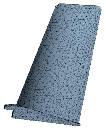 The FE model of the turbine blade was built as shown in Figure 3. The FE model includes 97,795 elements and 160,516 nodes. In term of the means of random parameters in Table 1 and the FE basic equations of the blade (shape function of tetrahedron [38], geometric equation [39], physical equation [40]), the static deterministic analyses of the blade deformation and stress were conducted, in which the deformation is radial deformation, and the stress is Von Mises stress in this paper. When the analysis reached stability, the distributions of the blade Von Mises stress and radial deformation are drawn in Figure 4 and Figure 5.
