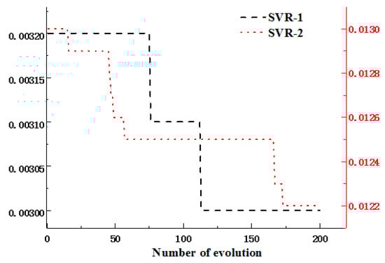 The input random variables in Table 1 were sampled by LHS [36] at the critical point as the blade stress and deformation reach to the maximum. In other words, the critical points were the maximum values of the blade deformation and stress acquired by the above static deterministic analyses. The output responses of maximum stress and deformation were obtained by static analyses based on the extracted samples. The samples were normalized as the training samples for SVR modeling. To improve SVR modeling accuracy, the parameters θ = (c, σ, ε) of SVR model were optimized by an artificial bee colony (ABC) algorithm [25]. The fitness function of the ABC algorithm was defined as the mean square error (MSE) in the training process of the SVR model. Two hundred iterations were generally performed to gain the fitting curves of blade stress’s SVR (SVR-1) and deformation’s SVR (SVR-2). The two curves are drawn in Figure 6. SVR models are determined in respect of the optimal parameters (c, σ, ε) searched by the ABC algorithm. The coefficients of fuzzy multi-SVR learning models involving blade stress and deformation are shown in Equations (5) and (6). In coming work, we employ the two fuzzy multi-SVR learning models to carry out the RBDO of the multi-failure turbine blade.