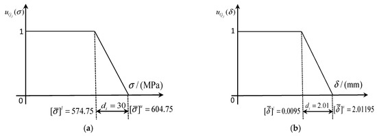 Membership functions of blade allowable failures. (a) Allowable stress membership function, (b) allowable deformation membership function.