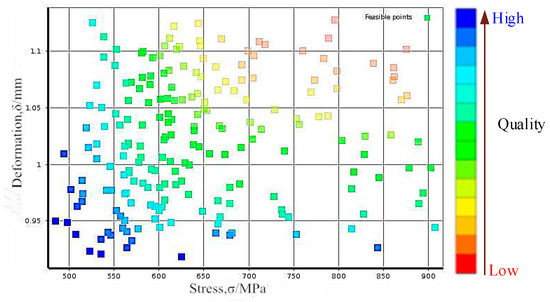 In NSGA-II algorithm [24], we consider the coefficient of optimal front-end individual as 0.3, and the population size as 100, the evolutional generation as 200, the stop algebra as 200 and the deviation of fitness function as 10e-2. By solving the RBDO model in Equation (7), the Pareto optimal solution set of blades and the distributions of blade stress and deformation are shown in Figure 8 and Figure 9, and the optimization results are shown in Table 3. It should be noted that 10,000 simulations were conducted in each probabilistic analysis involved in the RBDO of the turbine blades with the proposed approach.