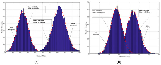 Figure 8 indicates the quality of sample points, as the samples closing to coordinate axes are of high quality, and vice versa. In line with the Pareto picture in Figure 8, most of the sample points (optimal solutions (blue points)) set are distributed near the two axes and a spot of solutions are far from the two axes, which illustrate the high quality of the gained optimal solution set and the reliability of acquired samples. As demonstrated in Figure 9 and Table 3, under the conditions where the allowable stress and allowable deformation of the blade meet the distribution characteristics of the fuzzy membership function, the means of the optimized blade stress and deformation after optimization are obviously reduced by about 100 MPa and 0.084 mm respectively. The standard deviations of stress and deformation after optimization are weakly decreased by about 3 MPa and 0.002 mm respectively, relative to these before optimization. In this case, the optimal values of rotational speed and temperature are 1200.1 rad/s and 1110.9 K. Therefore, it is supported that the developed RBDO model with the fuzzy multi-SVR learning method is effective for the RBDO of the blade with multi-failure modes (i.e., deformation failure and stress failure).