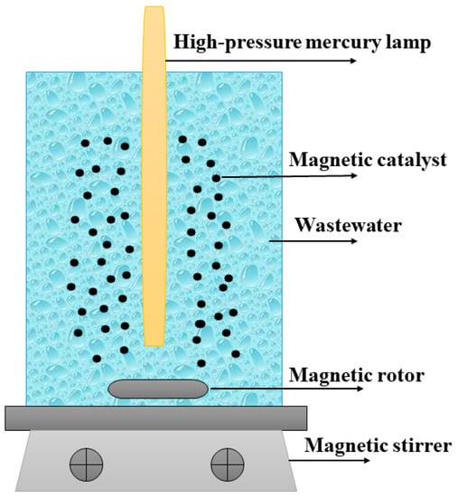 The heterogeneous photocatalytic treatment of the secondary biotreated effluent of pulp and paper mill wastewater was performed in a GHX-V photochemical reactor (Shanghai Jiapeng Technology Co., Ltd., Shanghai, China); a schematic of the device is shown in Figure 1. The light source used was a 200 W high-pressure mercury lamp (wavelengths of 350–450 nm), and the reaction temperature was adjusted to 25 ± 2 °C. During each run, 250 mL of the wastewater was added to the reactor, and the initial pH of the reaction was adjusted using a 0.1 M NaOH or H2SO4 solution. Next, a certain amount of the FMNs sample in question was added to the solution. The suspension was stirred continuously and exposed to light. The CODCr value was determined by taking water samples at regular intervals. All the experiments were performed for same duration (180 min) in order to elucidate the effects of the photocatalytic treatment. Each group of samples was tested thrice, and the average CODCr was calculated. The CODCr removal rate of wastewater (α) can be calculated from the initial CODCr (C0) and the CODCr during sampling (Ct) as follows: