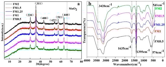 The FTIR spectra of the as-synthesized nanocomposites are shown in Figure 2b. In the cases of FMNs0.5 and FMNs1, the absorption peak at 574 cm−1 can be assigned to the Fe-O stretching vibrations that occur in iron oxide. Further, the characteristic peak at 3420 cm−1 is related to the stretching vibrations of the O-H bond and may be ascribable to the hydroxyl groups present on the sample surfaces. The peak at 1635 cm−1 corresponds to COO-stretching in citrates or peroxyacetic acid, while the peak at 1395 cm−1 can be attributed to the stretching of the C-O bond in citrates []. The peak at 458 cm−1 can be ascribed to the stretching of the Mn-O bond in MnO2 []. In addition, a peak related to the Fe-O stretching vibrations was also observed in the cases of FMNs1.25, FMNs1.5, and FMNs2 but at a lower wavenumber (541 cm−1), owing to an increase in the Mn-O bond strength [].
