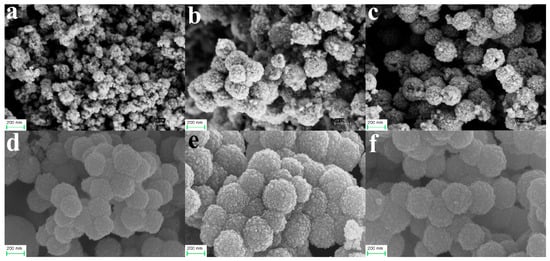 The dosages of (NH2)2CO and C6H5Na3O7·2H2O determined both the morphology and the size of the HFNs. Figure 4 shows FESEM images of the HFNs synthesized using the different initial (NH2)2CO/C6H5Na3O7·2H2O molar ratios. Figure 4a–c show the images of the HFNs produced using 8 mmol of C6H5Na3O7·2H2O. It can be seen from Figure 4a that the nanoparticles of sample HFNs1 had diameters of 20–30 nm. With an increase in the amount of (NH2)2CO added, as shown in Figure 4b,c, nanoparticles with rough surfaces and a diameter of approximately 200 nm were formed, as in the cases of HFNs2 and HFNs3. Moreover, a few incompletely formed spherical structures were also observed, indicating that the formed nanospheres were hollow. Figure 4d–f show FESEM images of the HFNs formed using 12 mmol of C6H5Na3O7·2H2O. It can be seen clearly that the HFNs had diameters of 200–300 nm and were well dispersed and fully formed. In summary, it can be concluded that the amount of C6H5Na3O7·2H2O used had a determining effect on the morphology and size of the HFNs formed. According to the molding conditions of the hollow nanospheres, HFNs6 sample was selected as the raw material for the subsequent experiments.