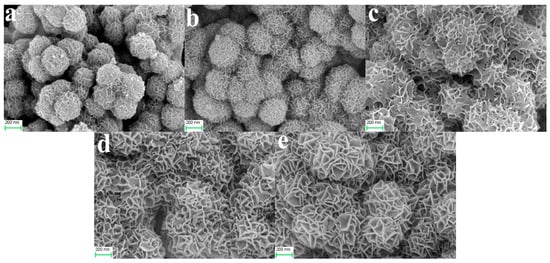 The TEM images (Figure 6) also showed that FMNs1.25 consisted of nanospheres whose surfaces were completely coated with nanosheets. It can be seen from Figure 6b–e that the nanospheres had a black edge and a grayish-white central region. This confirmed that they were hollow.