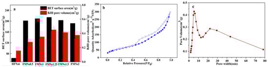 (a) Brunauer–Emmett–Teller (BET) surface areas and pore characteristics of HFNs6 and synthesized FMNs and (b) N2 adsorption–desorption isotherm and (c) pore size distribution of FMNs1.25.