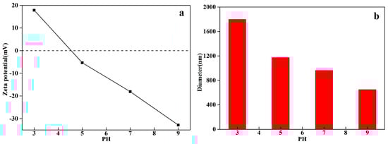 The zeta potential and (b) diameter of FMNs1.25 were observed with the PH. As seen in Figure 8a, the Zeta potential of FMNs1.25 decreased with the rise of PH, the point of zero charge (PZC) of FMNs1.25 appeared between 3–5 of the initial PH of the reaction system, indicating the surface of FMNs1.25 was positively charged in solutions at PH below the PZC []. Therefore, the electrostatic attraction forces predominated at pH 3, leading to more organic pollutants adsorbing on the surface of catalysts and the CODCr removal rate reached higher. The average diameter varied as a function of pH between 3 and 9, and the results are shown in Figure 8b. The highest diameter of FMNs1.25 was 1801.1 nm at the PH of 3, when the PH of the solution was 9, the diameter reached it lowest point at 649.5 nm. These results show that the dispersion of catalyst in solution was getting better with the increases of PH.