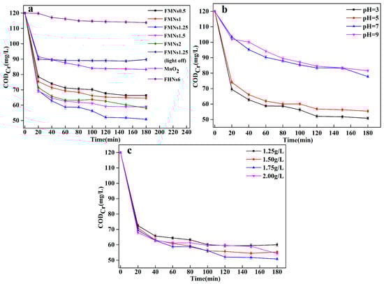 Effects of (a) FMNs sample, (b) initial PH, and (c) catalyst dosage on decrease in chemical oxygen demand (CODCr) of wastewater.