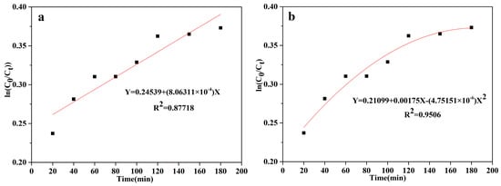The kinetics of the heterogeneous photocatalytic reaction were also studied. The software Origin 9.0 was used to fit the data corresponding to the relationship between the CODCr decrease rate and the reaction time. The reaction for the measurements was performed under optimized conditions, which were as follows: A reaction temperature of 25 °C, contact time of 180 min, with the following catalyst used: FMNs1.25, with an initial pH of 3, and a catalyst dosage of 1.75 g/L. Figure 10a,b show the pseudo-first-order-kinetics and pseudo-second-order-kinetics models obtained after multiple fittings. The fitting equation for the pseudo-first-order-kinetics model is Y = 0.24539 + (8.06311 × 10−4) X, with the pseudo-first-order-kinetics rate constant being 8.06311 × 10−4 and R2 = 0.87718. In addition, the fitting equation for the pseudo-second-order-kinetics model is Y = 0.21099 + 0.00175X − (4.75151 × 10−6) X2, with the pseudo-second-order-kinetics rate constant being −4.75151 × 10−6 and R2 = 0.9506. In the figures, the y-axis represents ln(C0/Ct) while the x-axis represents the reaction time (min). These results indicated that the catalytic reaction was primarily driven by pseudo-second-order kinetics.