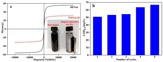 (a) Hysteresis loop of FMNs1.25 and (b) effect of number of reaction cycles on CODCr (optimized reaction conditions: Initial CODCr of 120 mg/L, FMNs1.25 concentration of 1.75 g/L, contact time of 180 min, solution pH of 3, and temperature of 25 °C).