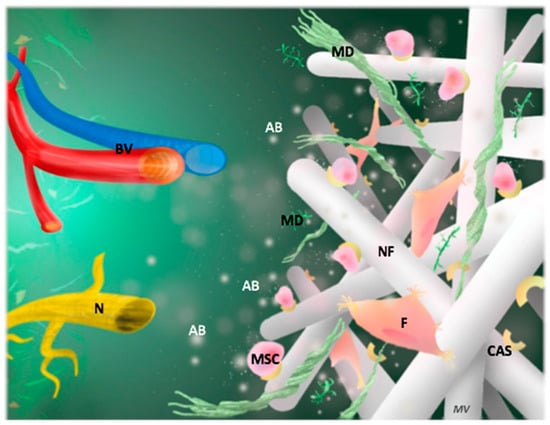 Polymer instructive scaffold for endodontic regeneration. Incorporation of active biomolecules inside the scaffold allows orchestration of tissue regeneration and attraction of resident cells according to ‘’cell homing process’’. Stem cells cultured in the scaffold optimize the pulp regeneration, notably matrix deposition. AB; Active biomolecules (white rounds), BV; Blood vessels, CAS; Cellular adhesion site, F; Fibroblasts, MD; Matrix deposition, MSC; Mesenchymal stem cells, N; Nerves, NF; Nanofiber.