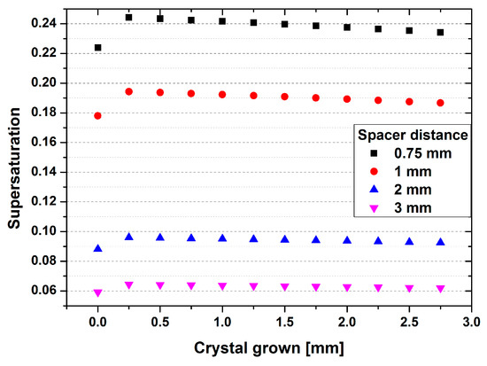 Supersaturation for SiC2 gas species as a function of grown crystal thickness. The values were calculated for an overall temperature of 1900 °C for four different source-to-substrate distances.