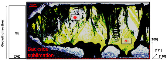 The current knowledge for the growth of silicon carbide using physical vapor transport (PVT) is understood quite well, yielding bulk crystals of up to 200 mm diameter and dislocation densities down to 2800 cm−2 [1,2,3]. To date, the consecutive growth and enlargement process for the hexagonal polytypes (4H- and 6H-SiC) using “standard” PVT is not possible for the cubic (3C-SiC) polytype, as a high supersaturation and a temperature gradient is needed to stabilize it. In this context, the sublimation epitaxial approach (SE) using the sublimation sandwich method already presented by Tairov et al. [4] in 1976 was implemented and demonstrated the suitability to grow 3C [5,6]. However, the growth of bulk material using this method is challenging due to the lack of seeding material. Nevertheless, high-quality 3C layers can be obtained using the heteroepitaxial approach of growing the layers on silicon substrates by chemical vapor deposition (CVD) [7,8,9]. Due to the misfit between 3C-SiC and silicon, the wafers are under a lot of stress, leading to bent or even cracked material. By transferring CVD-grown layers on a SiC carrier, a seeding stack can be produced, to perform subsequent growth by SE [10].