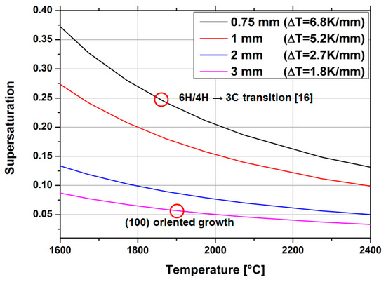 From simulation data, the temperature gradient was extracted for four different source-to-substrate distances (0.75, 1, 2 and 3 mm). With these values, the supersaturation was calculated for the growth-limiting gas species SiC2 as a function of temperature. The data are presented in Figure 6. The previously discussed supersaturation necessary for a transition from hexagonal to cubic silicon carbide is highlighted with a red circle for a distance of 0.75 mm.