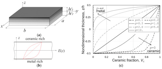 where, and are the volume fraction of ceramic on the bottom and top surfaces, respectively. The case of and refers to the gradation profile from pure metal on to pure ceramic on . It follows from (5) that the FGM plate is ceramic-rich when the parameter , and metal-rich when the parameter . Figure 1c shows the volume fraction variation of the ceramic phase along the plate thickness depending on the values of the power-law index p.