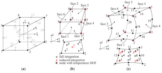 As mentioned in the Introduction, a 3D graded finite element has been developed for performing the modal frequency analysis of FGM sandwich plates in [62,63]. To incorporate a variation in the elastic properties of the heterogeneous material into the finite element, the material user-defined subroutine UMAT that establishes the tangent element stiffness matrix was programmed, while the average mass density value was adopted to determine the element mass matrix. In our study, the performance of the 3D graded finite element is extended to provide thermal loading and temperature-dependent material properties for carrying out the thermomechanical analysis of the FGM sandwich plates. Such an analysis requires computing and storing the internal thermal energy and the heat flux which comply with the energy balance equation (1) and Fourier’s law of heat conduction (3), respectively, as well as modifying the mechanical behavior by accounting for thermal strains (2). The implementation of a spatial variation of the thermal and modified mechanical properties in the selected direction in the 3D graded finite element has been done following the procedure outlined in [59] for a 2D graded finite element. With this approach, a master 3D temperature-displacement finite element, either eight-node linear C3D8 or twenty-node quadratic C3D20 brick isoparametric element with either reduced or fully integration scheme, which are available in ABAQUS (Figure 2), has been supplemented by a combination of user-defined subroutines such as UMAT, UMATHT, and USDFLD, [56]. In addition, it should be mentioned that ABAQUS interpolates the temperature field using only the first-order approximation regardless of the order of approximation of the displacement field, as shown in Figure 2b,c.