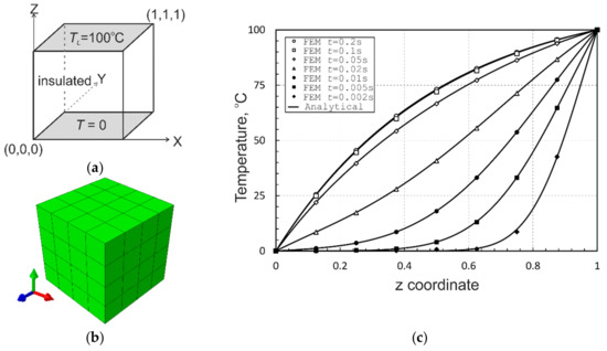 In the finite element simulations, the cube is discretized with 4 × 4 × 4 twenty-node quadratic brick graded elements, as illustrated by Figure 3b. A transient heat transfer analysis is performed with ABAQUS, calling the material subroutines UMATHT and USDFLD. The temperature profile along the z−axis is plotted at different times for the given exponential material variations and compared with the analytical solutions, as shown in Figure 3c. It is evident from the plot that the numerical and analytical results are in excellent agreement.