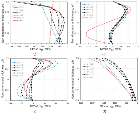 With these calculations it was found that the calculated results converge to the reference data in [35] with an increase of the number of graded elements in the thickness direction. The best agreement between both the solutions was achieved using eight graded elements across the plate thickness. This resulted in time-consuming computations in the case of cubic elements used in the mesh. In order to speed up the computations, brick graded elements, with an aspect ratio 4:4:1, have been used instead. The elements provided more than 10 times faster computations with the same through-the-thickness profiles for variations of temperature and quite acceptable results for temperature-induced deflections and stresses across the thickness, as illustrated in Figure 4b–f, respectively, as compared with those in [44]. Therefore, such elements are used in the calculations to follow.