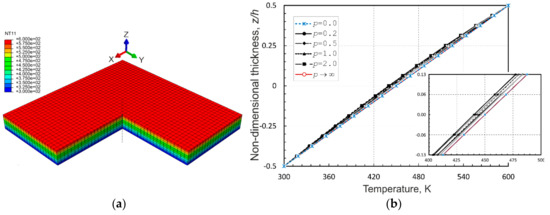 The material subroutine UMAT was programmed to define a through-the-thickness variation of the Lamé constants, and , and the stress-temperature modulus, , associated with the thermal expansion coefficient, . The distributions across the thickness of the material thermal properties were incorporated into the element by coding the specific heat, , the thermal conductivity, , and the film heat transfer, , coefficients in the UMATHT subroutine. Finally, the through-the-thickness variation of mass density was incorporated into the element using the USDFLD subroutine. Moreover, if the material parameters were deemed to exhibit a temperature dependence, appropriate relationships (7) with given coefficients for each material parameter were also programmed as functions of the temperature in the mentioned subroutines. In doing so, the instantaneous temperature, T, was known as it is a variable passed for information at each time increment in the subroutines, and therefore, the property was able to be computed at any current temperature value.