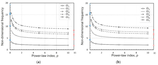 It is worth noting that there is very good agreement between the present results and the referenced solutions, as seen in Table 3 to Table 6. This demonstrates the accuracy and effectiveness of the 3D graded finite element developed in the present work. In addition, for the sake of clear demonstration of the effect of the material gradation profile on the natural frequencies, some frequencies from Table 5 and Table 6 for the simply supported and clamped FGM plates subjected to the nonlinear temperature rise are plotted as functions of the volume fraction exponent p in Figure 6a,b, respectively. It is obvious from the plots that the frequencies decrease with an increasing in the power-law index, i.e., growing the percentage of ceramic fraction in the top thickness of the FGM plates. In doing so, the higher frequencies show more intensive descending trends.