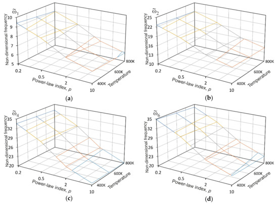 The effect of the temperature on natural frequencies of SSSS square 1-8-1 sandwich plates with different material gradients in SUS304/Si3Ni4 cores: (a) the first nondimensional frequency; (b) the second non-dimensional frequency; (c) the fourth non-dimensional frequency; and (d) the sixth non-dimensional frequency.