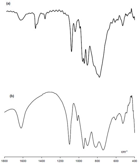 FT-IR spectra in the polyoxoanion region (1800–400 cm−1), measured as KBr disks, of (a) TBA-1 and (b) K6[B-α-H3P2W15O59{Al(OH2)}3]⋅14H2O.